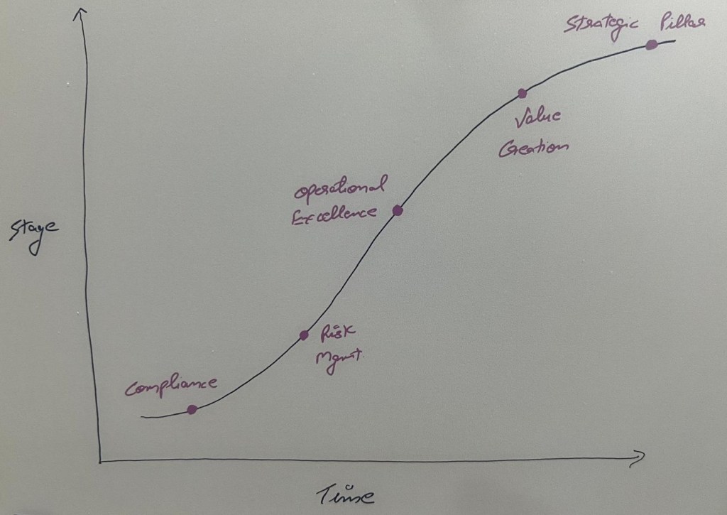 Having spent many years now not only leading large multinational corporate sustainability programs, but also observing how companies across different industries approach their ESG journeys, I have realized that organizations go through what I like to call a “Sustainability Maturity Curve“. While the curve may indicate where you are on your sustainability journey, I think a better way to interpret will be to look at it as an answer to the question: “Why are you doing whatever you are doing on sustainability?”. Framed this way, it removes any judgement on maturity levels of your ESG programs (which I admit is not the intent of the title!), but rather helps you align your efforts and investment of time and resources. When you honestly acknowledge the reasons behind your ESG strategy, it should give you clarity of mind and confidence in your response when confronting questions around how much should I focus on sustainability and what does it do to my business. So what this curve about?